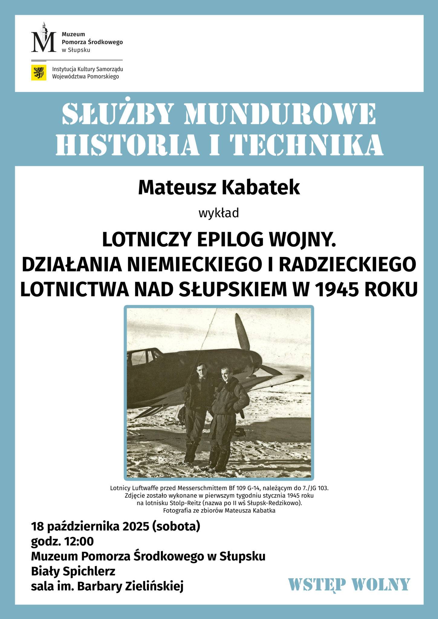 Jak pisze Mateusz Kabatek: „będzie to opowieść o mało znanych epizodach z ostatnich miesięcy II wojny światowej. Katastrofy Messerschmittów Bf 109 G, nocne loty Junkersów Ju 52 z zaopatrzeniem dla odciętych jednostek Wehrmachtu, zrzuty agentów na tyły frontu czy tajna misja jednego z pierwszych niemieckich śmigłowców tworzą barwny i zaskakujący obraz końca wojny w powietrzu. Nie zabraknie także wątku radzieckich nalotów na Słupsk i działań samolotów spod znaku czerwonej gwiazdy wspierających ofensywę 2. Frontu Białoruskiego. Wykład przybliży te wydarzenia, odsłaniając nieznane dotąd wątki lotniczej historii regionu. Pora zatem zapiąć pasy i rozpocząć lot w przeszłość!”.